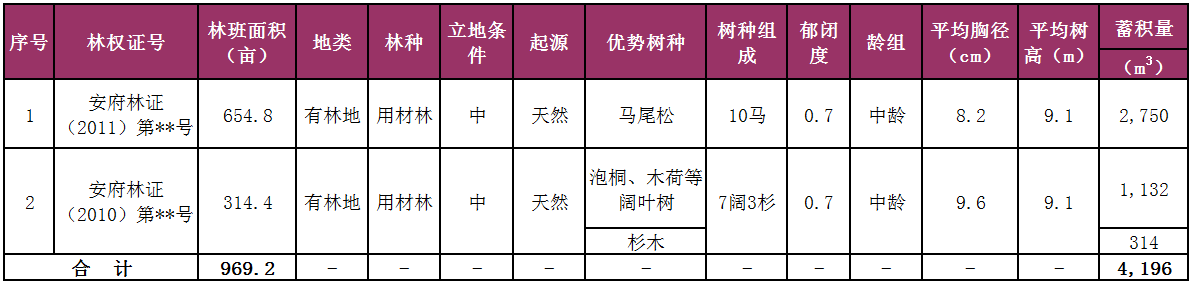 估价对象:江西省赣州市安远县969.20亩以马尾松、杉木、泡桐、木荷等为主的用材林资产和其林地使用权,共涉及两本林权证,具体情况见下表: